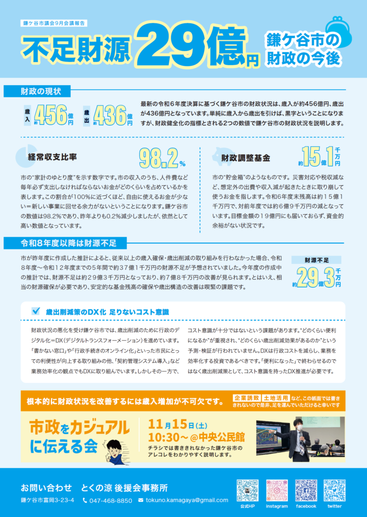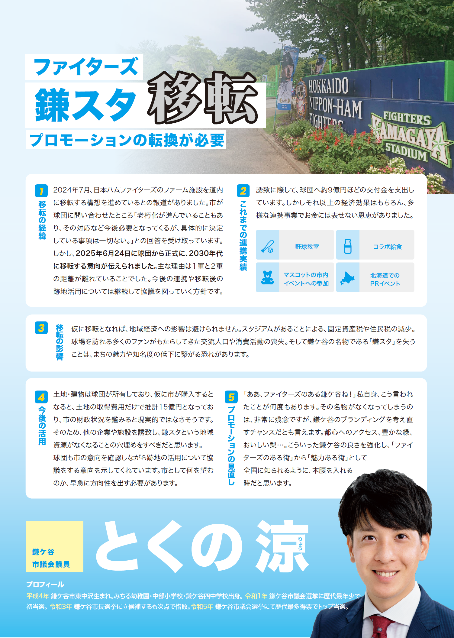 鎌ケ谷市のブランディングを考え直すチャンス 投稿者: 徳野 涼2025年11月6日2025年11月6日news 新しいチラシが完成しました。ファイターズ鎌スタ移転についてと、鎌ケ谷市の財政の今後についてまとめています。