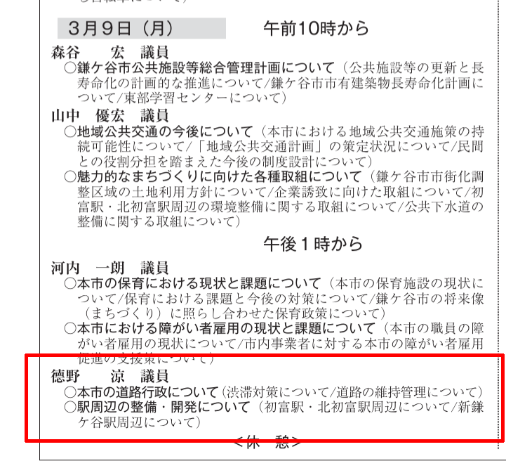 市議会 一般質問 3/9(月)14:00頃〜 投稿者: 徳野 涼2026年03月1日2026年03月1日news 3月会議の一般質問のお知らせです! 3/9(月)14:00頃〜市役所R階にて行います。 ご都合よろしければ傍聴いただけると嬉しいです。 今回のテーマは・渋滞対策・各駅周辺の整備です!よろしくお願い致します